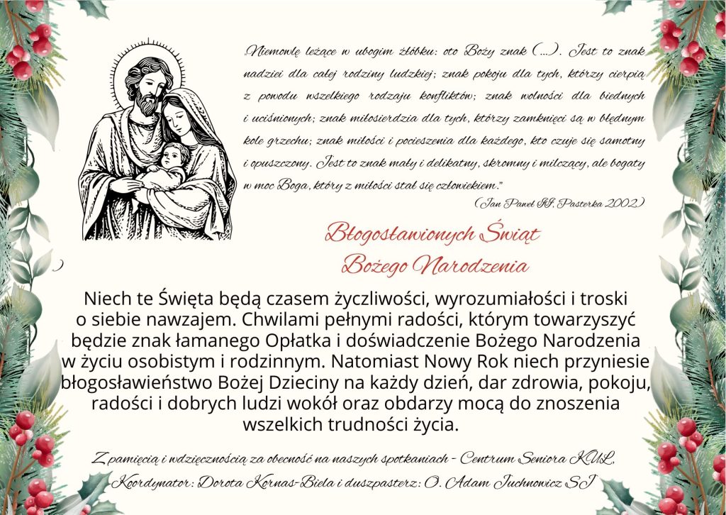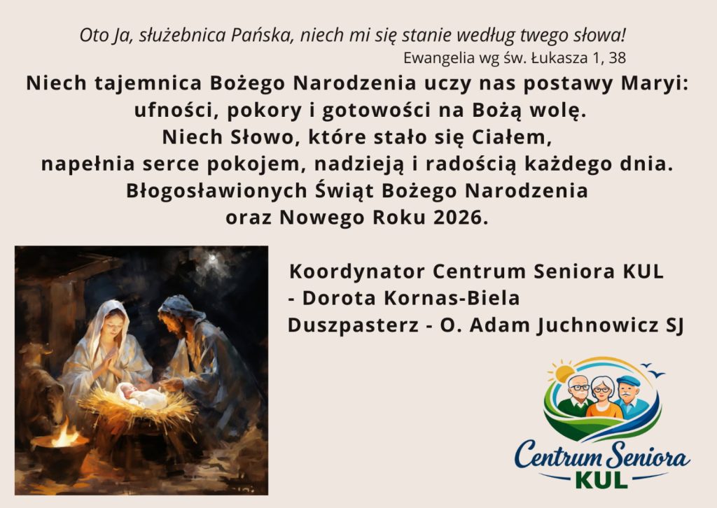10.01.2026. Sobota. Comiesięczne, tym razem świąteczne spotkanie. Program: godz. 12.00. różaniec św. i o godz. 12.30 msza św. w Kościele Akademickim KUL. Następnie w Kuluarach Smaku spotkanie z ks. prof. Piotrem Wiśniewskim, prorektorem do spraw misyjnego wymiaru działalności KUL, w tym m.in. poczęstunek, życzenia Księdza Prokrektora, dzielenie się opłatkiem. W drugiej części spotkania godzinną prelekcję ilustrowaną zdjęciami na temat „Doświadczenie misyjne w Kenii” wygłosiła pani Nikola Dzikowska, studentka pedagogiki specjalnej oraz psychologii KUL. Bardzo dziękujemy Księdzu Prorektorowi za odprawienie mszy św. i homilię, za złożone nam życzenia oraz prezent dla każdego uczestnika w postaci Kalendarza KUL na 2026 rok. Pani Nikolii Dzikowskiej dziekujemy za podzielenie się interesującymi informacjami oraz refleksją z pobytów jako wolontariuszka misyjna Ruchu Oazowego w Kenii. Szczęść Boże w nowym roku!